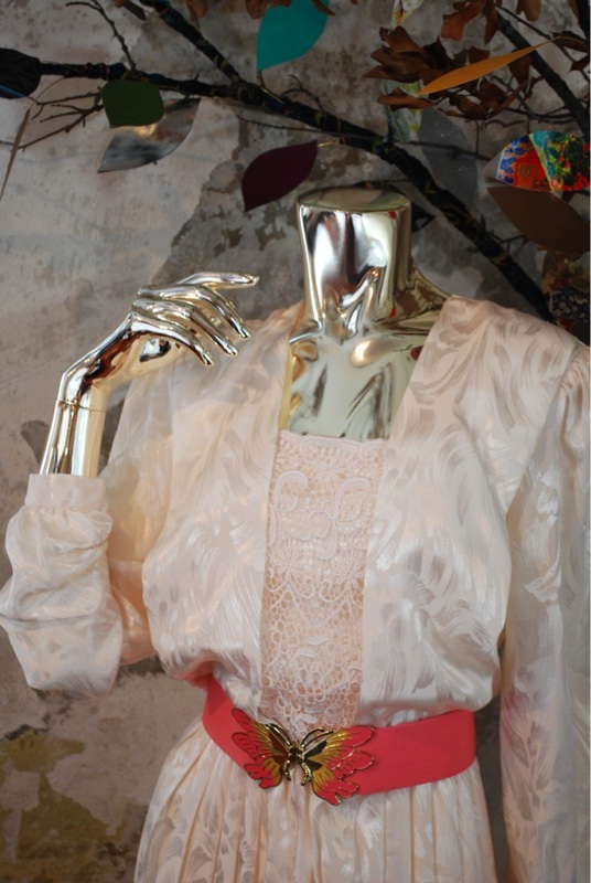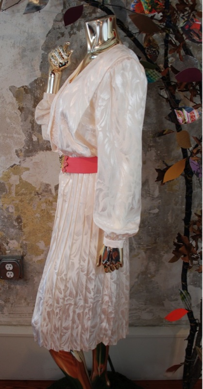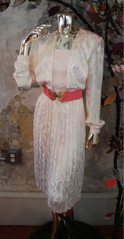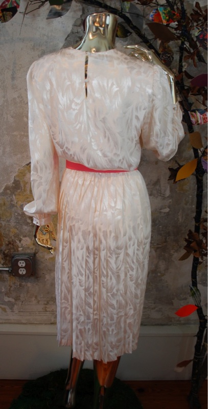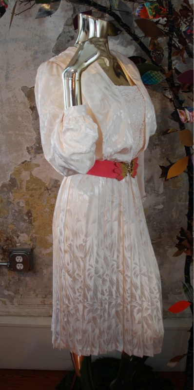 Item Descriptionn Style.... Evening; Dinner; Cocktail-Dress Cut.... Loose; Flowing Material.... Soft (light weight satin possibly) Label.... In The Mood: London, Paris, New York Color.... Cream Pattern.... Brush stroke cream satin on cream, and white lace Bodice.... Billowy fit; Shoulder pads; Lace in front; Keyhole button in back Neckline.... Rectangular Sleeves.... Long; Gathered at cuff with button Waist.... Elastic Skirt.... Full; Free or open; Pleated Pant.... N/A Length.... Knee Buttons.... In back of bodice, and on cuff; Covered in matching fabric Zips.... No Lined.... Bodice Condition.... MINT~ Appears new: No signs of wear; washed and possibly worn; no flaws Size.... No size tag (see measurements) Misc.... To make super cute and sexy, update it by bringing up the hem about 6 inches, Not pinned on model