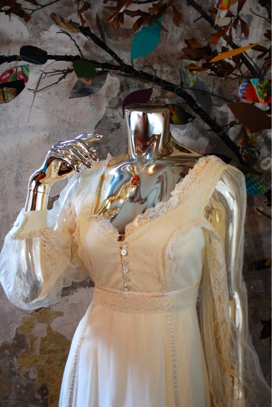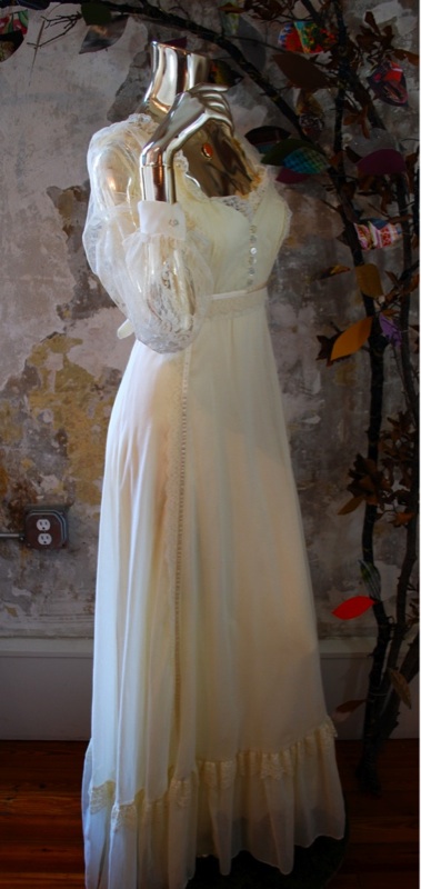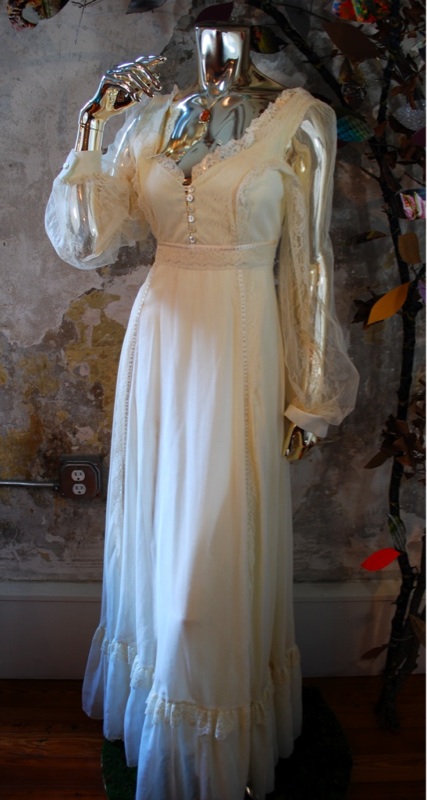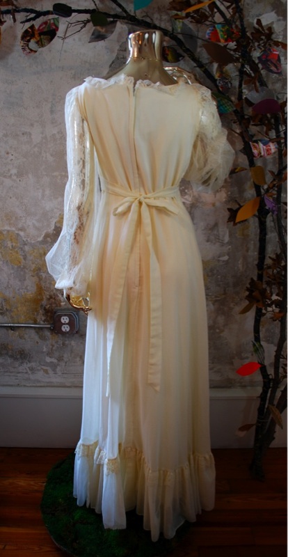 Item Descriptionn Style.... Prairie, Hippie, Boho, Wedding Cut.... Maxi, Empire Material.... Cotton Label.... Gunne Sax Color.... Cream or Beige Pattern.... None; solid cream or lace Bodice.... Form fitting, buttons down the front, accents of lace and ribbon Neckline.... V-Neck accented by lace Sleeves.... Sheer lace, long sleeve, with cuff that buttons Waist.... Empire, attached belt ties in back Skirt.... Long, free and open or full, with ruffle at bottom, lace and ribbon detail Pant.... N/A Length.... Ankle Buttons.... Creamy Pearlescent Zips.... Up the Back Lined.... Fully Condition.... EXCELLENT~ Previously worn, with only very slight wash wear; no flaws Size.... No size tag (see measurements) Misc.... Not pinned on model