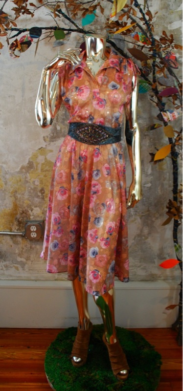 VTG 70s Tan FLORAL Secretary Day Dress M