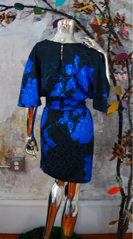 Item Descriptionn Style.... Secretary, Hipster, Cocktail Cut.... N/A Material.... Silk Label.... None Color.... Blue & Black Pattern.... Floral Bodice.... Bat-Wing like; Open Neckline.... Scoop Sleeves.... Fluttery, cap-sleeves Waist.... Elastic gather with matching cumberbund belt Skirt.... Mini; Pencil, with ruffled detail Pant.... N/A Length.... Thigh Buttons.... Key-hole in back bodice; One button, black plastic Zips.... No Lined.... No Condition.... MINT~ Appears new: No signs of wear; washed and possibly worn; no flaws Size.... No size tag (see measurements) Misc.... Pinned on model