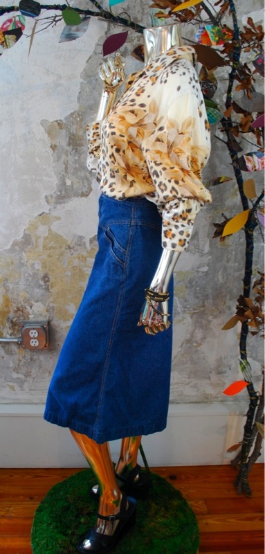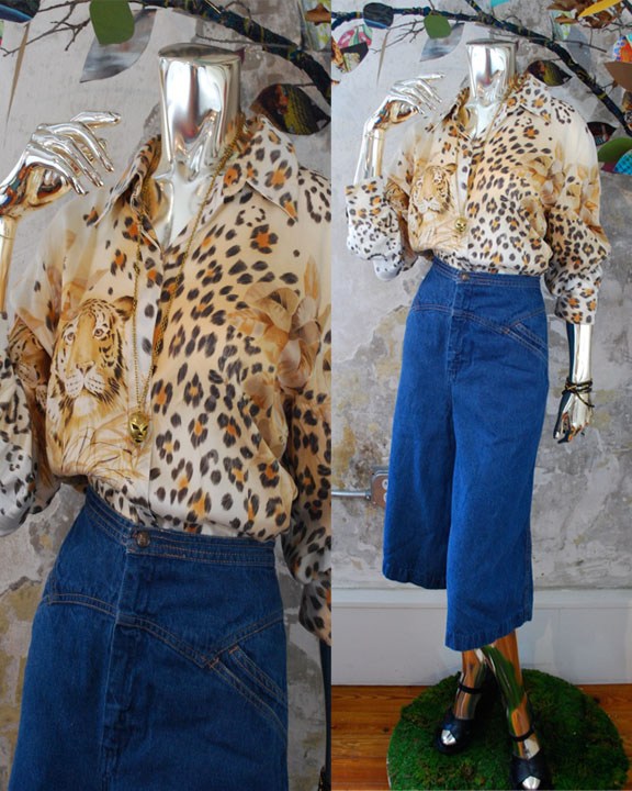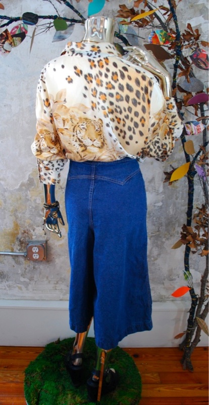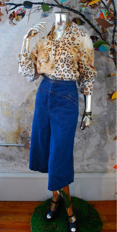 Item Descriptionn Style.... Boho, Hipster, Hippie Cut.... Jean Skirt, Gaucho Material.... Denim Label.... Goose' Color.... Blue Denim Pattern.... None Bodice.... N/A Neckline.... N/A Sleeves.... N/A Waist.... High Rise, Contrast stitching, Buttons in front Pant.... Wide legs; Lots of front and back detail; 4 front pockets Length.... Below knee Buttons.... 1~ Copper or Brass Zips.... In front Lined.... No Condition.... EXCELLENT~ Previously worn, with only very slight wash wear; no flaws Size.... No size tag (see measurements) Misc.... Pinned on model
