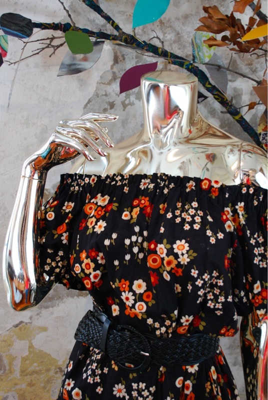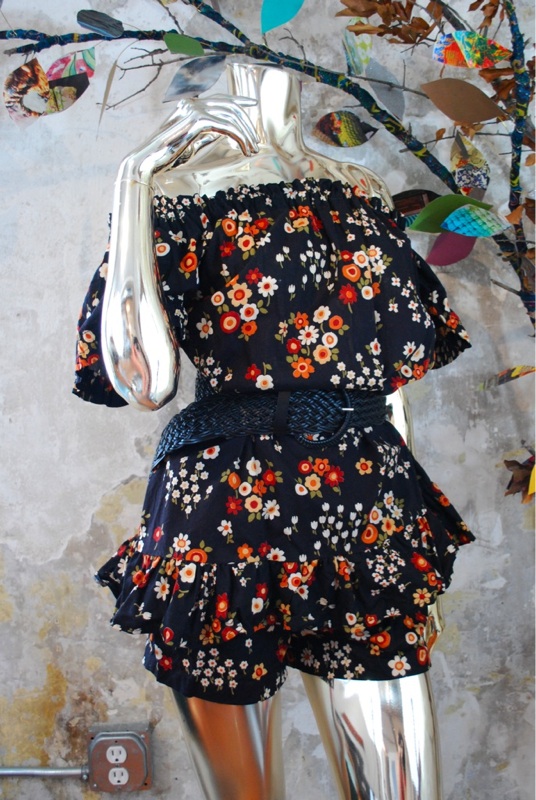 Item Descriptionn Style.... Hot Pant, Hippie Cut.... A-Line Blouse Material.... Cotton Label.... None (vintage home made) Color.... Black Pattern.... Orange, White and Tan Floral Pattern Bodice.... Full Open Neckline.... Gathers a la 'peasant style' Sleeves.... Bell shaped, ruffled short sleeves Waist.... Shorts: Gather at waist. Top: purposely puckered at sides of waist for more tailored look Skirt.... N/A Pant.... CUTE Short Shorts Length.... Upper Thigh Buttons.... None Zips.... No Lined.... No Condition.... VERY GOOD~ Previously worn with moderate wash wear/fade, but no visible flaws Size.... No size tag (see measurements) Misc.... Not pinned on model