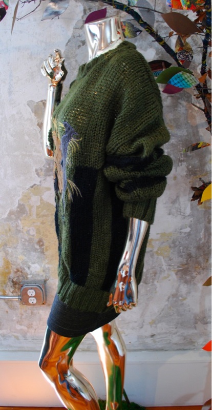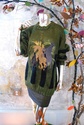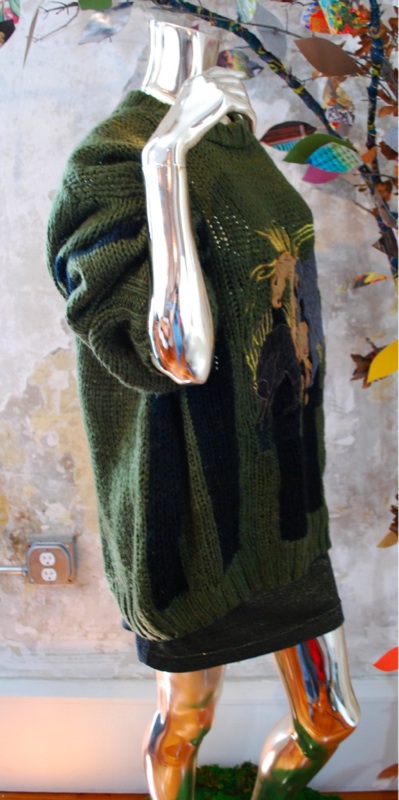 Item Descriptionn Style.... Boho; Hipster; Urban Cowgirl Cut.... Loose & baggy Material.... Knitted 100% Acrylic Label.... ZIZIANO Color.... Forest Green Pattern.... Leather and embroidered brown, black and grey horses, rearing up in excitement Bodice.... Loose fit Neckline.... Crew neck Sleeves.... Long, with 2 black stripes on them Skirt.... N/A Pant.... N/A Length.... Hits at hip; Straight hem Buttons.... No Zips.... No Lined.... No Condition.... GOOD/PLAY~ Previously worn with minor visible flaw(s), and/or significant wash wear/fade. The grooviness of the piece makes for a desirable item, and it still has a lot of wear left Size.... No size tag (see measurements) Misc.... Pair with cute short black skirt and give it a right now look! Not pinned on model