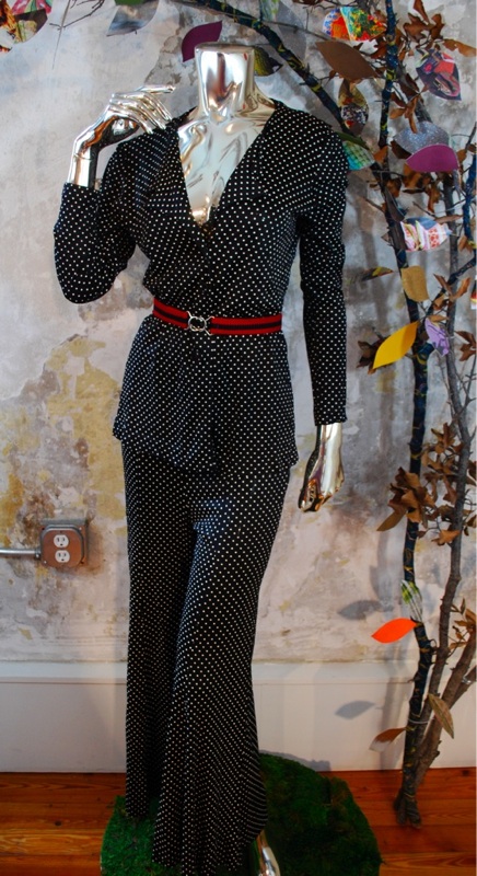 Item Descriptionn Style.... Mod, Hippie, Cool Hipster Cut.... Suit Material.... Poly Label.... Ladies Garment, Union Made Color.... Black and White Pattern.... Polka Dot Bodice.... Straight Hem; Buttons Up the Front Neckline.... Pointed Collar Sleeves.... Long Sleeves Waist.... Pant: Straight, Flat Waist-line Skirt.... N/A Pant.... Bell Bottom Length.... 41.5" Overall (27" Inseam) Buttons.... Fabric Covered Buttons Zips.... Pants Zip in Back Lined.... No Condition.... EXCELLENT~ Previously worn, with only very slight wash wear; no flaws Size.... No size tag (see measurements) Misc.... Not pinned on model