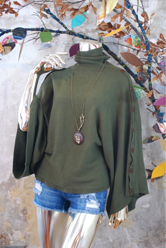 Item Descriptionn Style.... Hipster, Indie, Boho Cut.... Batwing; Turtleneck Material.... Acrylic, Nylon Label.... Colour Works Color.... Olive Green Pattern.... None Bodice.... Loose, open fit Neckline.... Turtleneck Sleeves.... Batwing; Loose open fit with button details down the top Waist.... Has button detail on either side Skirt.... N/A Pant.... N/A Length.... Hits at upper hip Buttons.... Square brown Zips.... No Lined.... No Condition.... EXCELLENT~ Previously worn, with only very slight wash wear; no flaws Size.... M (see measurements) Misc....