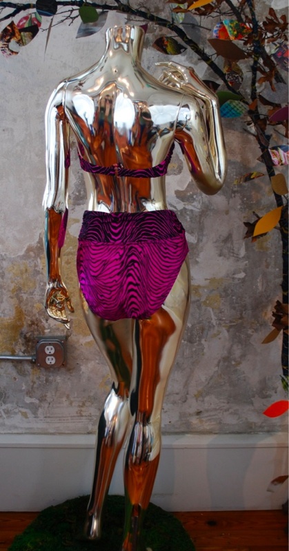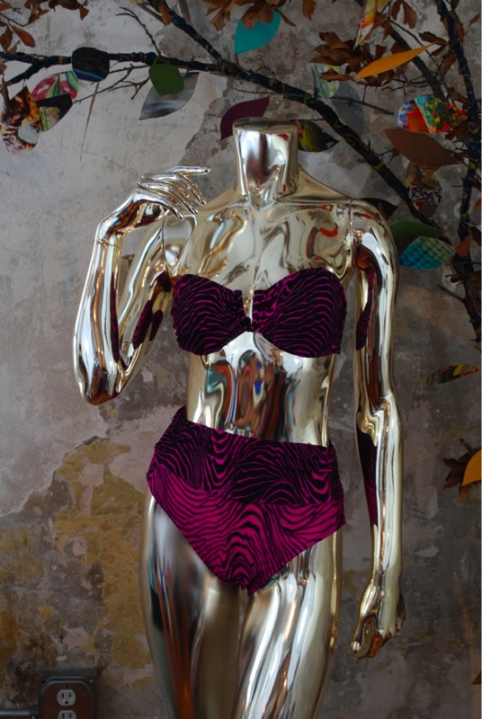 Item Descriptionn Style.... Punk, Retro Cut.... Bikini Material.... Spandex Label.... None Color.... Hot Pink, Black Pattern.... Zebra Bodice.... Gathered, Center 'V' shape, Strapless, Hooks in back Neckline.... Open Sleeves.... None Waist.... High Rise, Gathered at hips Skirt.... N/A Pant.... N/A Length.... N/A Buttons.... None Zips.... None Lined.... No Condition.... EXCELLENT~ Previously worn, with only very slight wash wear: No flaws Size.... No size tag (see measurements) Misc....