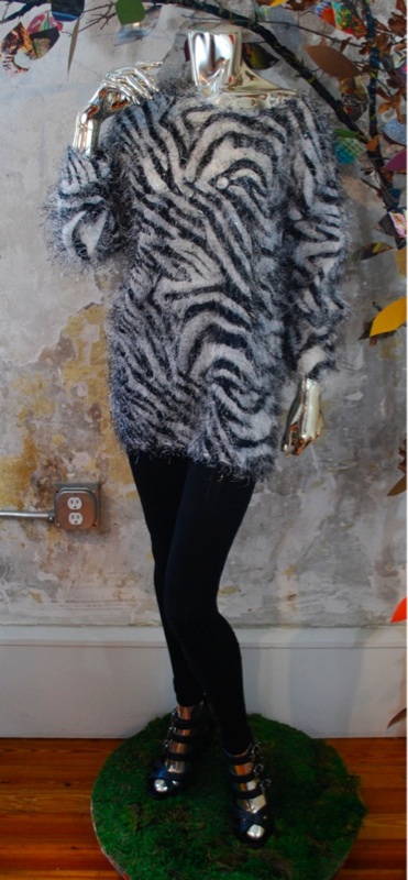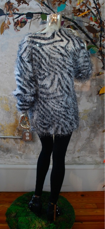 Item Descriptionn Style.... Fringe sweater/blouse Urban, Punk Cut.... Straight Material.... Poly/Cotton Label.... None Color.... Black, White Pattern.... Zebra Bodice.... Loose fit Neckline.... Scoop Sleeves.... Long Waist.... Open Skirt.... N/A Pant.... N/A Length.... Hip length Buttons.... None Zips.... No Lined.... No Condition.... VERY GOOD~ Previously worn with moderate wash wear/fade, but no visible flaws Size.... No size tag (see measurements) Misc.... Bring your inner animal out with this fabulous fringe zebra print sweater