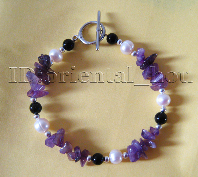 Charming Bracelet made of Black Agate about 6mm and white FW pearl about 7-8mm and some Amethyst chips.Good quality,High luster! |
