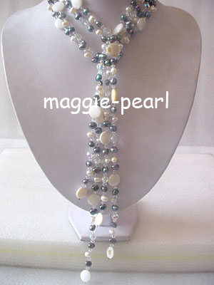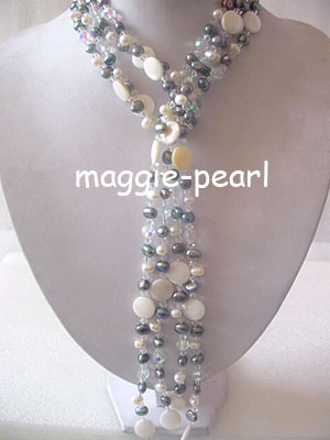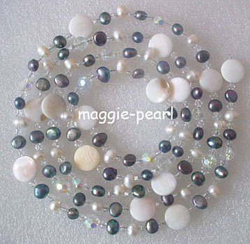 2-STR white crystal&black FW pearl&shell bead necklacePrice:  $9.00