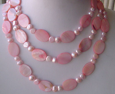 The auction is for a necklace made of pink Freshwater pearl about 6-7mm and oval shell pearl.Good quality.It is 50" in length.The necklace is without the clasp. You can wear in many ways!