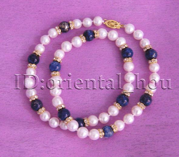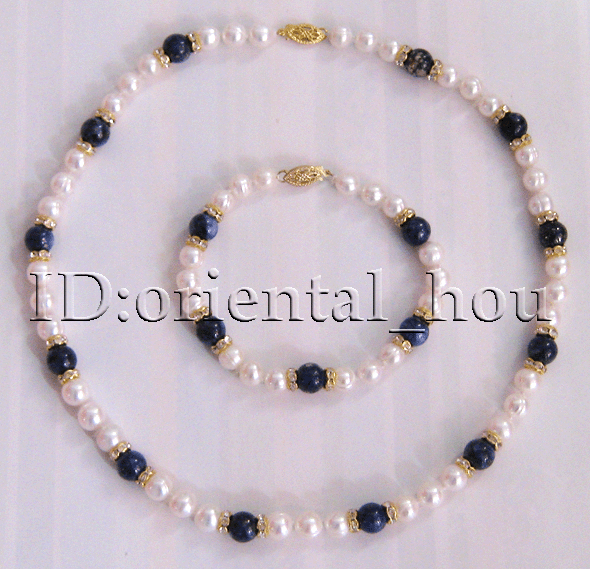 This sets consisting of necklace and bracelet, white fw pearl abot 7-8mm and natural lapis lazuli about 8mm. |