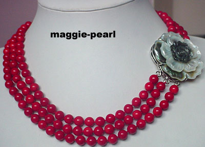 The 3-ROW necklace 17.25"-19.25" in length is made of AAA red coral measuring 7.5mm with a big beautiful shell flower clasp.Good luster.Don`t miss it. Length:17.25"-19.25" Material:AAA red coral Unit:one | |