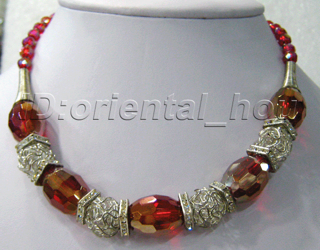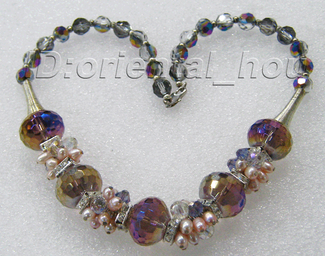 Charming necklace made of 8mm,12x16mm colored gray crystal with small facet and 5x6mm pink rice fw pearl.Very beautiful!Good quality,High luster! |
