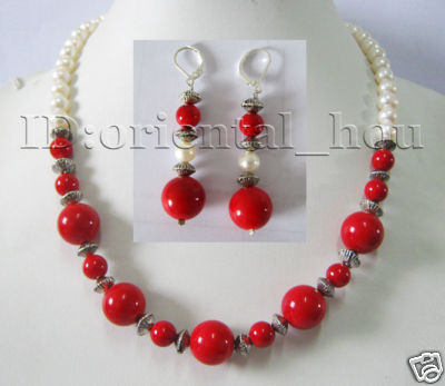 Wonderful necklace,matching earrings made of 7-8mm White Freshwater Pearls and 14mm Red coral bead Good quality. |