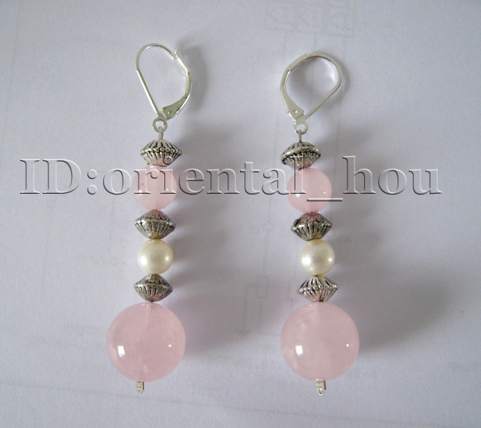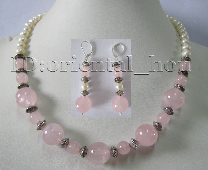 Wonderful necklace,matching earrings made of 7-8mm White Freshwater Pearls and 14mm rose quartz Good quality. |