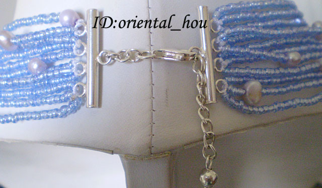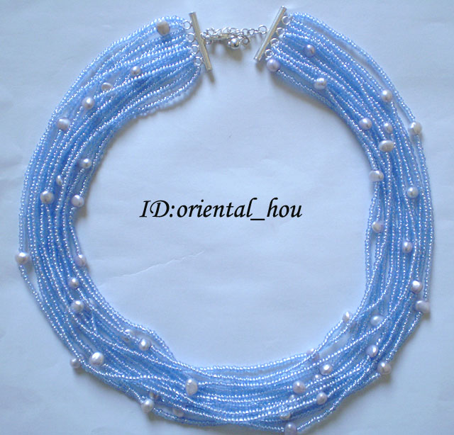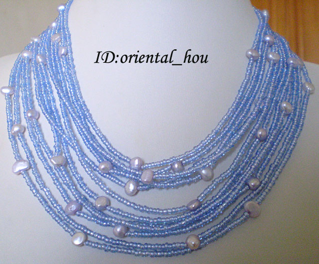 Excellent necklace consisting of 12 strands light blue glass beads and lavender Fresh water pearls measuring 5-6mm.The beautiful necklace is about 15.5"-17.5" with a sterling sivler clasp when wearing.