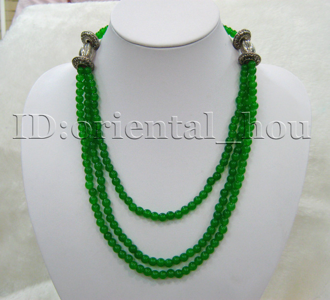 Charming necklace,3strands made of Round 6mm Green jade.Look at the pic.Good quality,High luster! |
