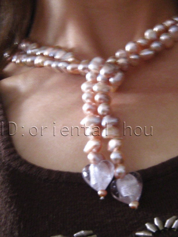 Wonderful necklace made of 7-8mm baroque natural purple fw pearl,end with two Pink murano Heart about 15mm.Good quality,high luster! |