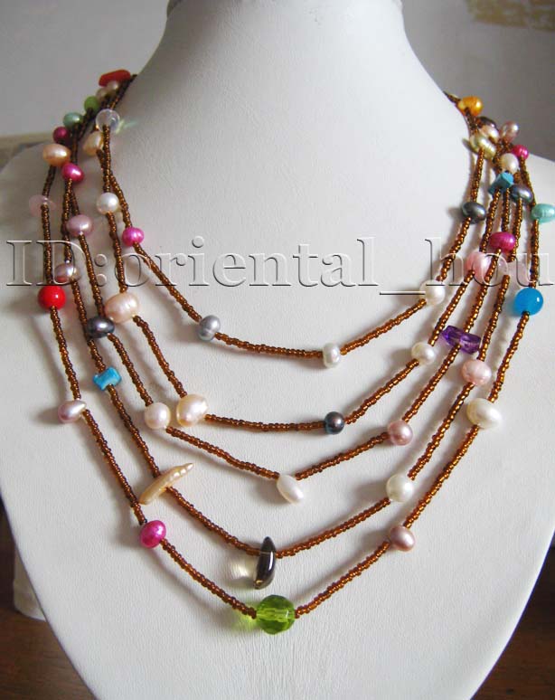 Charming necklace consisting of 5 strands made of multicolor pearls and stones and brown glass beads.Good quality.Best price. |