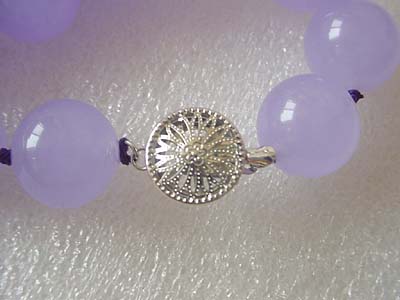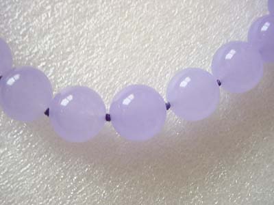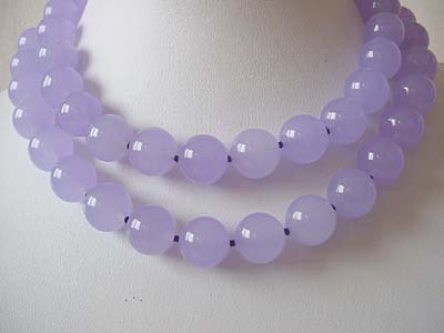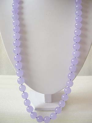 This necklace 33.5" in length is made of lavender jade 14mm in size.It is very beautiful and charmming. Don't miss it.