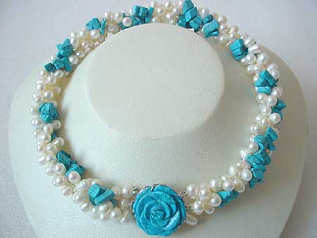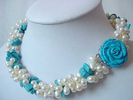 This necklace is 18.5" in length before twisted, it's made of tear drop freshwater pearl measuring approx. 6x7mm in diameter and turquoise chips with a beautiful flower clasp.The pearl is hand-knotted for safety and beauty. Length:18.5" before twisted Material:FW pearl, turquoise Unit:one necklace | |