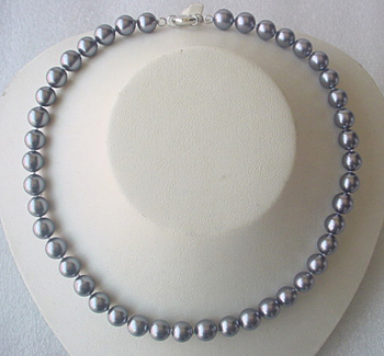 The necklace is made of dark silver mother of pearl 10mm in size with round clasp.The length is 17.5".Each pearl is hand-knotted on both sides for safety.The luster is very high.