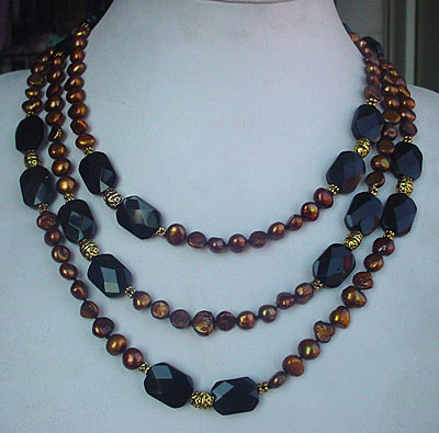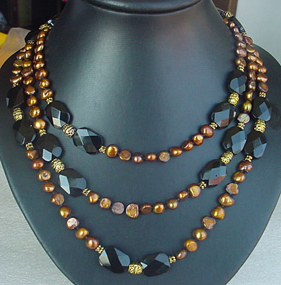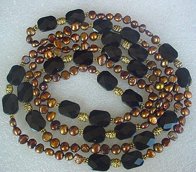 This long necklace measuring 60" is made of brown freshwater pearl 7-8MM and rectangle black onyx.Each pearl is hand-knotted on both sides for safety and beauty. It is beautiful fit to wear in fall. Material:FW pearl&onyx Length:60" Weight:120g Unit:one | | |