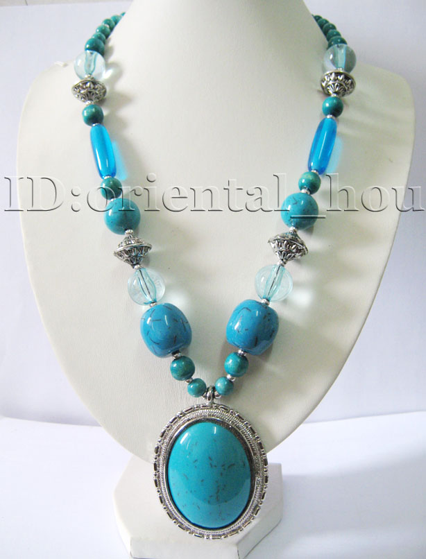 Wonderful necklace made of blue wooden beads about 8mm 10mm and turquoise about 20mm and a big turquoise pendant about 50x67mm.Very fancy,don`t miss it! |