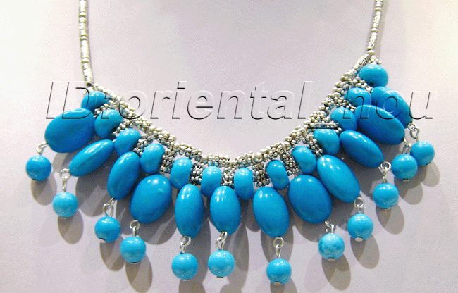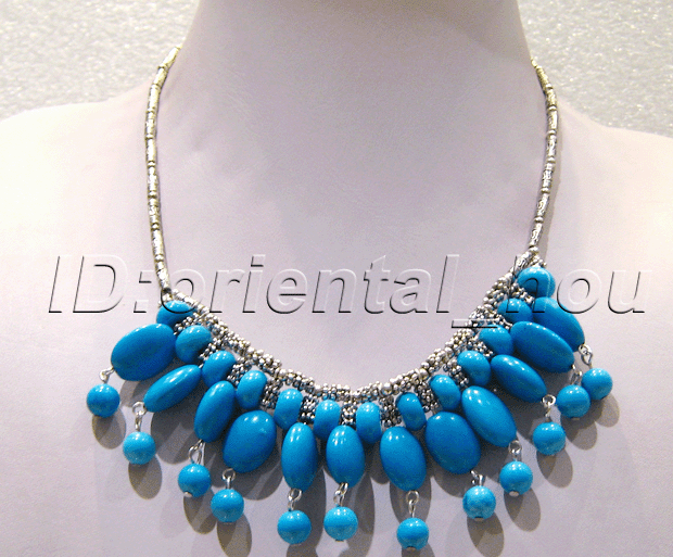 Charming necklace made of blue turquoise.13X17MM(Oval),8MM(Round).17.5" with a lobster clasp. |