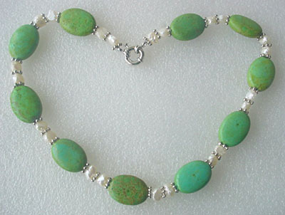The necklace is made of green turquoise oval shape 0.7"x1" in diameter and white FW pearl 6-7mm in size.The pearl with small protuberance is good for kin.The length is 18". Material: turquoise&pearl Length:18" clasp: plain Unit:one | |