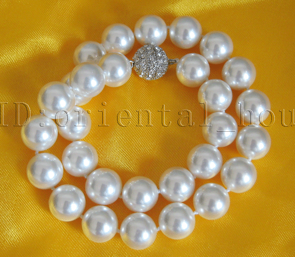 Beautiful!14mm WHITE Seashell Pearl Necklace-Rhinestone clasp