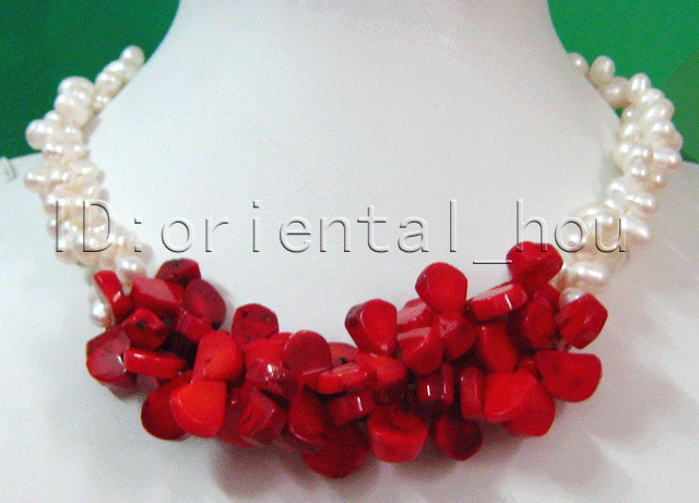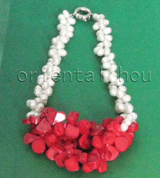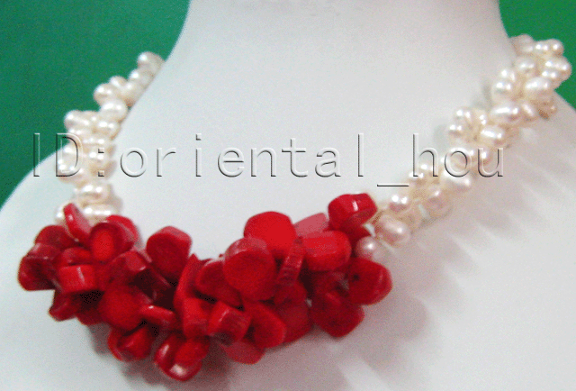 17.5" 2-STR WHITE FW PEARL & RED CORAL NECKLACE