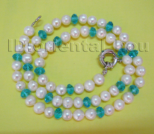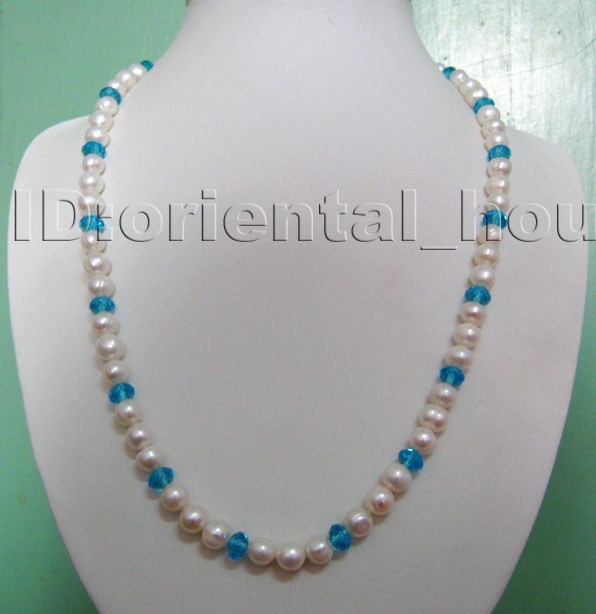 Wonderful necklace made of White Freshwater pearl about 8-9mm and blue crystal with samll facet.Good quality.Best price! |