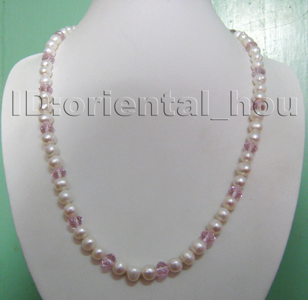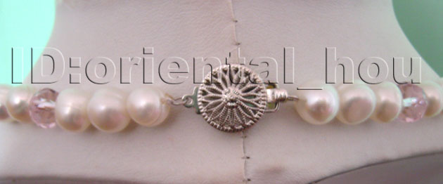 Wonderful necklace made of White Freshwater pearl about 8-9mm and light pink crystal with samll facet.Good quality.Best price! |