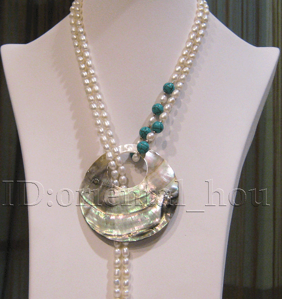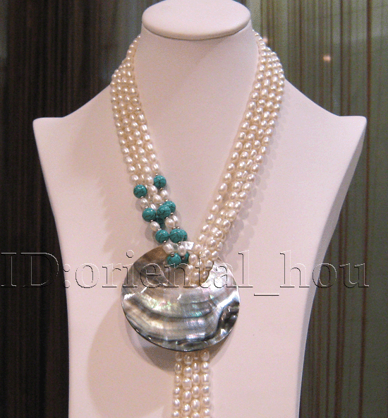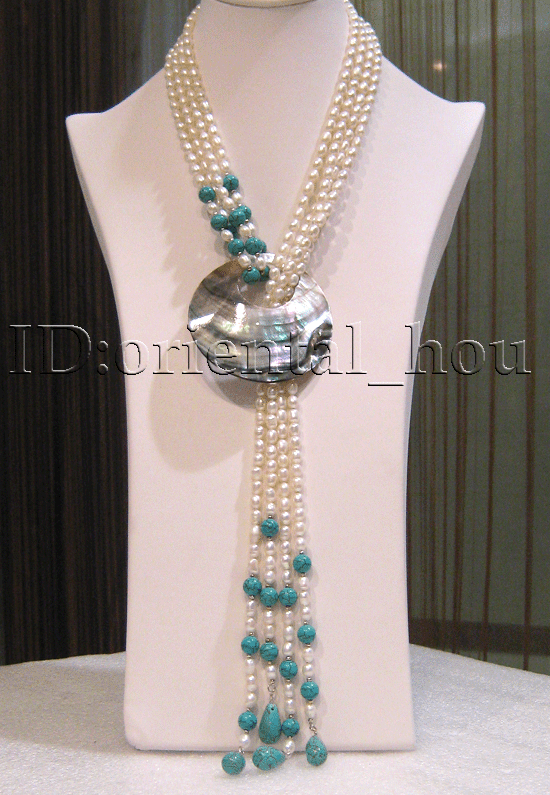 45" 2 stds White Rice FW pearl&8mm Turquoise Necklace