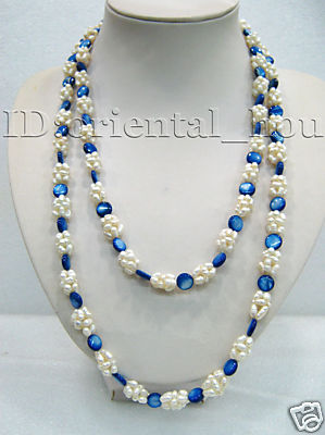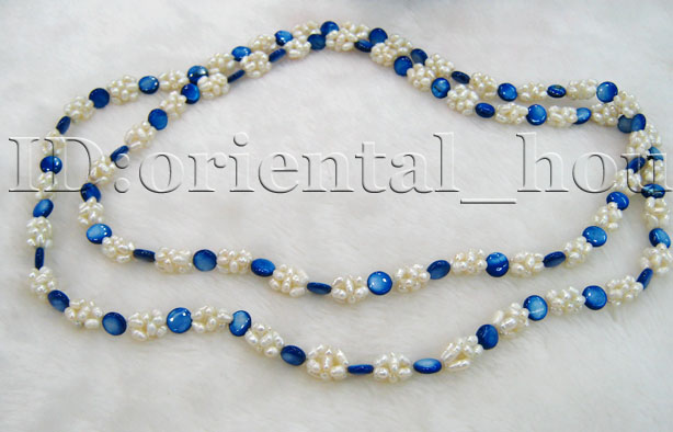 Charming long necklace made of white FW pearl ball and blue shell pearl.Good quality. |