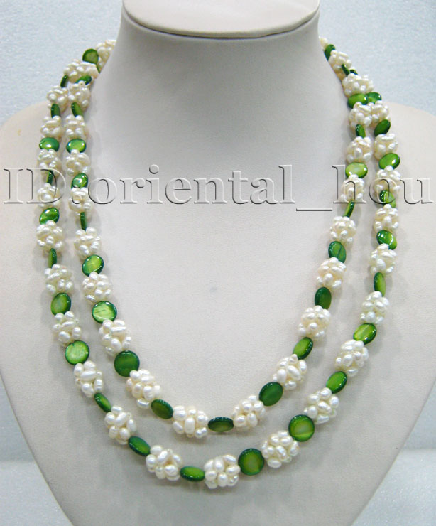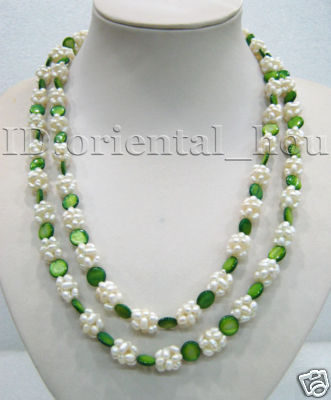 Charming long necklace made of white FW pearl ball and green shell pearl.Good quality. |