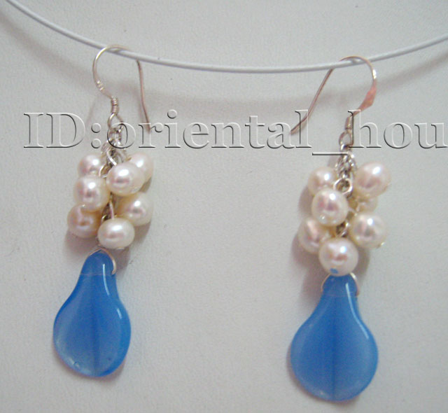 Charming dangling Earrings made of White Freshwater Pearl about 5-6mm and blue Wren Leaves shape about 14x20mm.Good quality.High luster! |