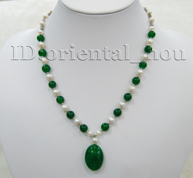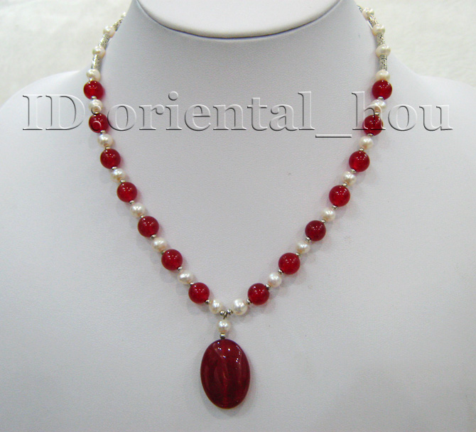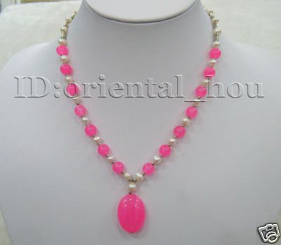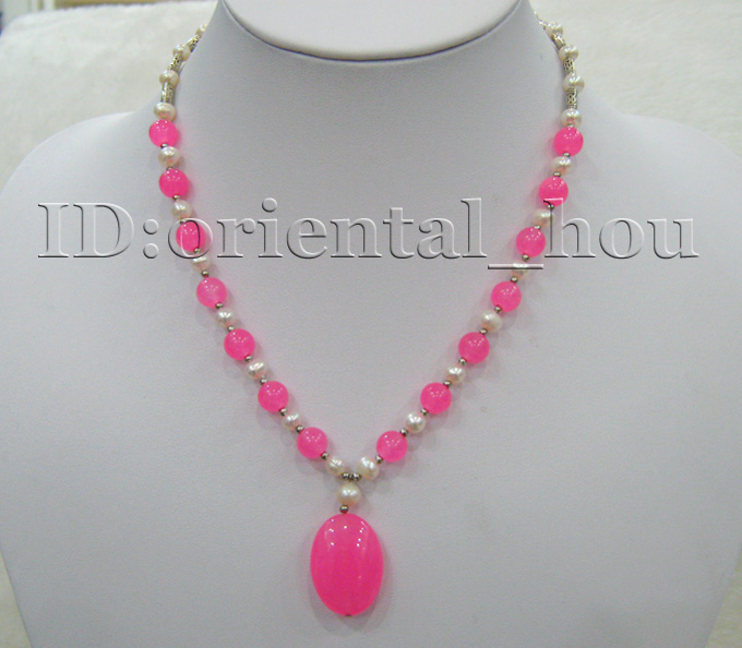 Wonderful necklace made of White Freshwater Pearl about 6-7mm and Hot Pink jade about 8mm,pendant 18x25mm.Look at the picture,Good quality,High luster! |