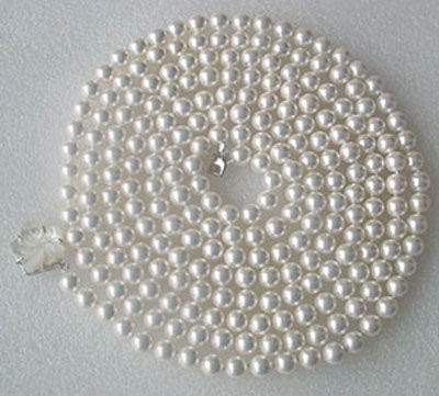 The necklace is 80" in length, made of white Mother of pearls 8mm in size. Round,Good luster, Best Quality.