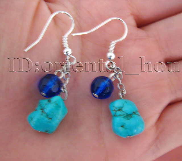 Wonderful dangling earrings made of baroque turquoise about 10x12mm and blue cryatal about 8mm.Good quality.Don`t miss it! |