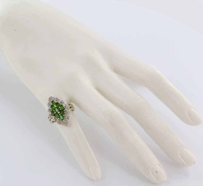 Stones: Nine approx. .05 carat estimated tsavorite garnet totaling .45 carat and twenty approx. single cut diamonds are beautifully embedded into this cocktail mount. The diamonds total
