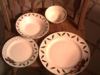 | NIB 4 pc Cades Creek Apples Leaves Lattice stoneware. Dinner plate, salad, soup, and dessert all included. NIB, box has top damage - see photo. Style #12940. Paypal accepted, please add $10 shipping. Shipped in a larger box with 2" of peanuts all around.