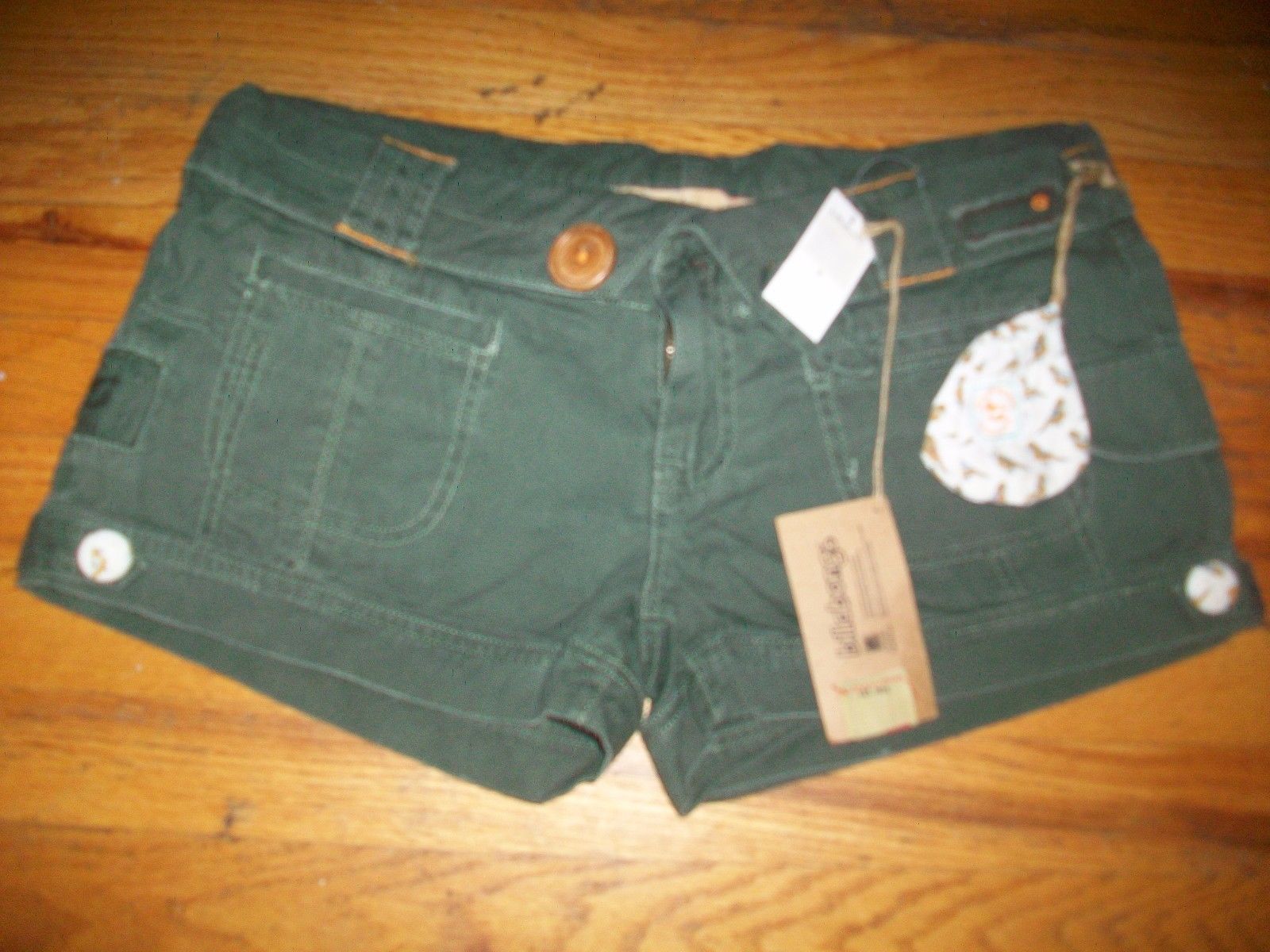 Billabong junior army green cotton shorts size 9 NWT'S COOL BUTTONS (BUTTONS ON LOWER SIDES OF SHORTS ARE COVERED WITH A BEAUTIFUL FABRIC MATERIAL!) EXTRA BUTTON INCLUDED. SHORTS MEASURE 34 X 2.75. RISE MEASURES 8 INCHES. ZIP FLY. BIG WAIST BUTTON WITH LOOP (LOOP GOES OVER/AROUND BUTTON). VERY COOL SHORTS! BACK FLAP POCKETS.