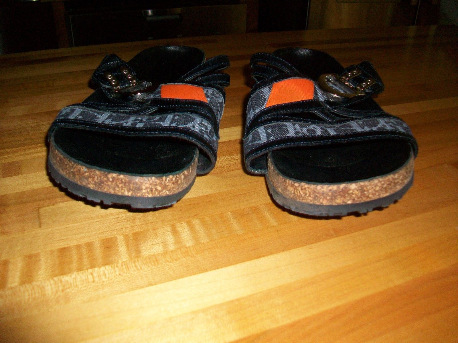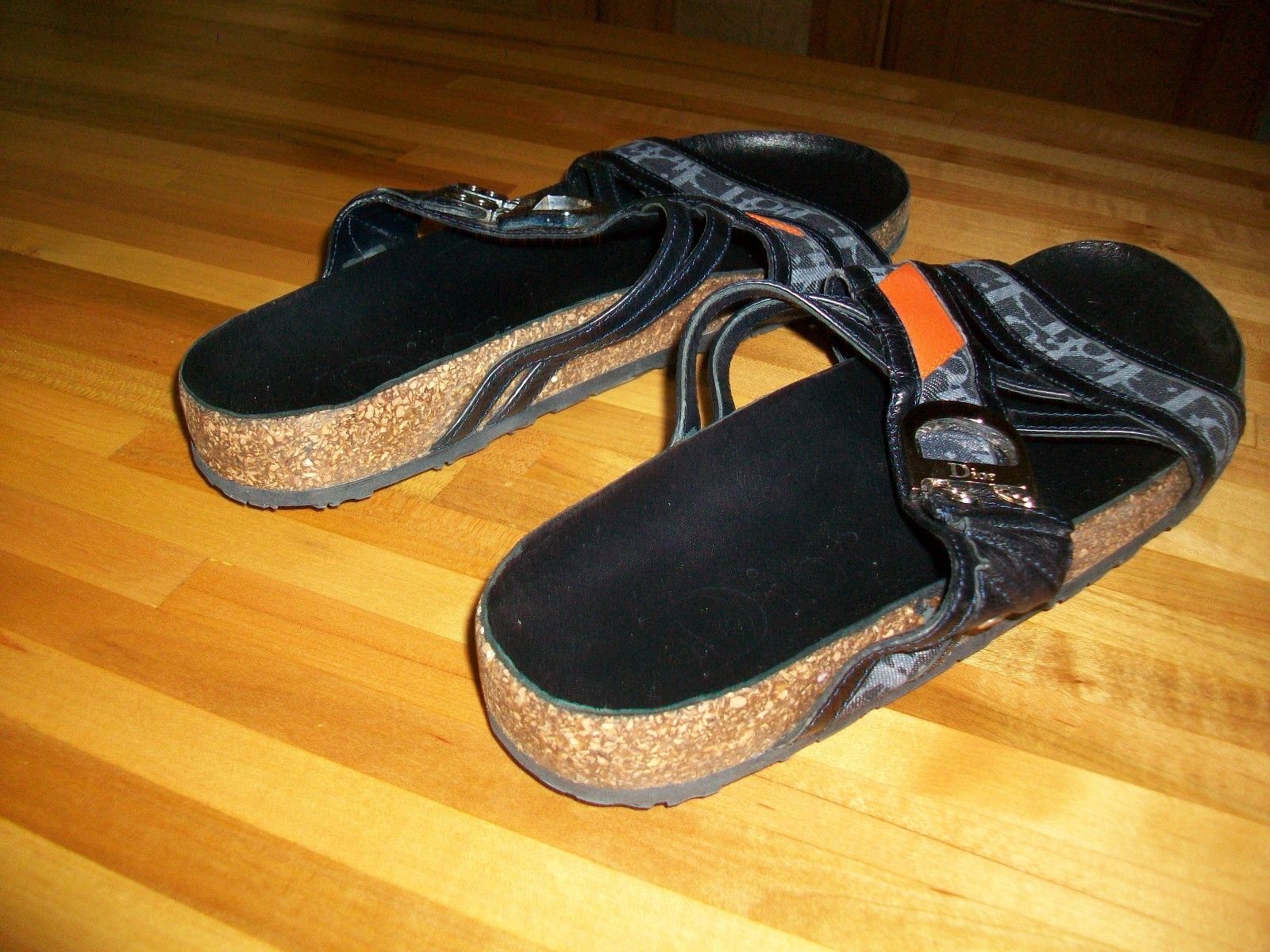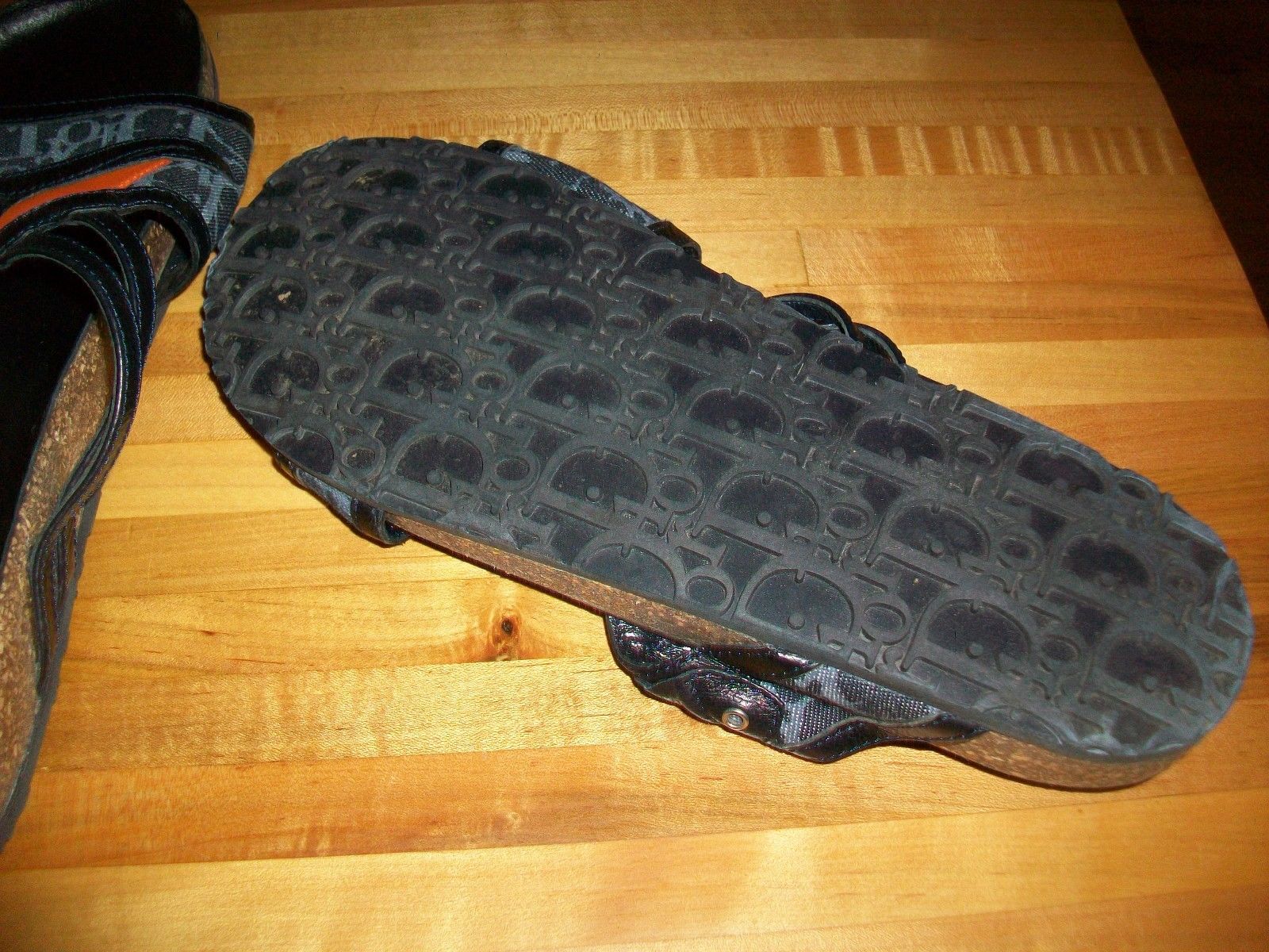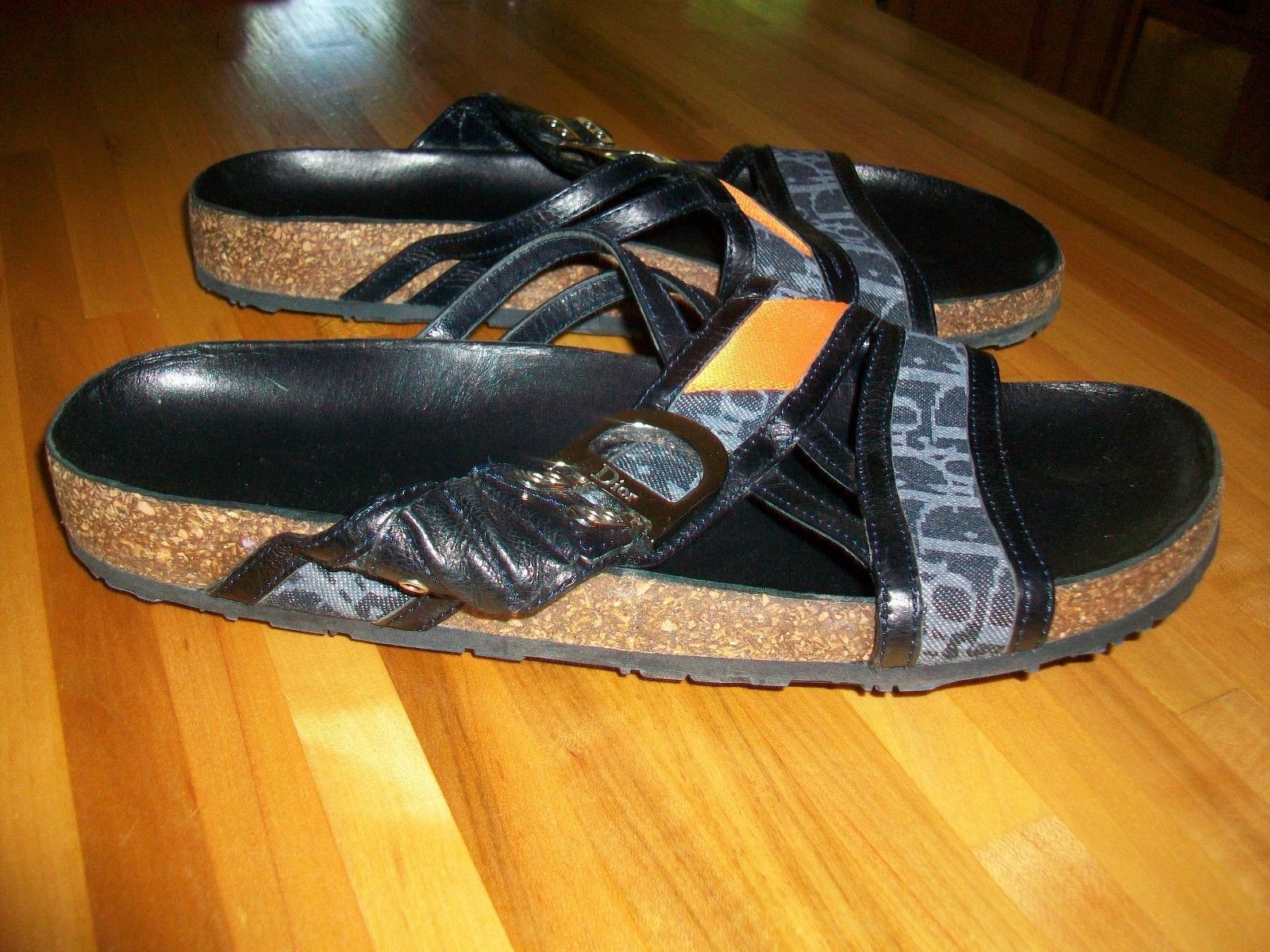 DIOR BLACK Leather Open Toe Flat COMFORT Slide On SandalS CORK BED Sz 41 US 10. BOTTOM OF SANDAL MEASURES 10.75 INCHES. GREAT UNISEX SANDALS IN NICE SHAPE!