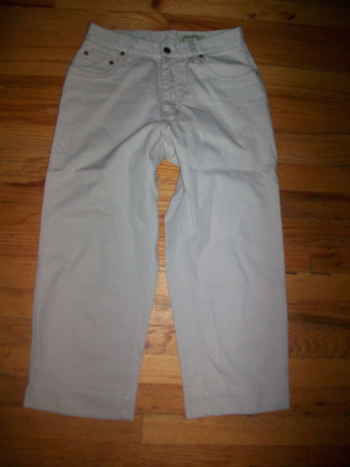 Eddie Bauer Womens Denim Capri JEANS SIZE 6 HI RISE BEIGE COLOR. ZIP FLY. 5-POCKET. CAPRI'S MEASURE 28 X 22. RISE MEASURES 10 INCHES. COMFY!