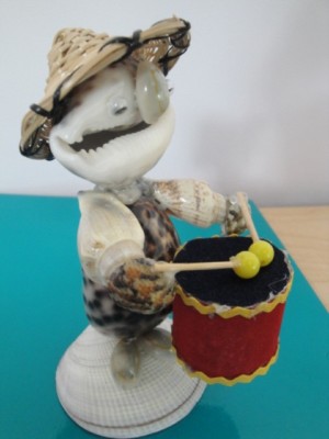 This figurine made of different sea shells and decorated with hat, drum, cigar & moving eyes. Philippines.