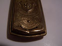 This lovely needle case measures approximately 2 and 3/4 inches in length and 1 and 1/8 inches wide.  It is clearly marked as seen in the photo "Manufactured by W. Avery & Son Redditch" on the bottom, and "Quadruple Golden Casket Patented" on the top.  There is a Fleur de Lis within a shield.  Both sides of the case are identical.  On one side, there is a minor ding towards the bottom (see photo).