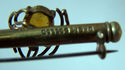 This is like nothing seen before! Normally when found, nanny pins are decorated with goldstone. This is highly unusual in that it features a spider made of an amber colored stone with brass legs. The body of the nanny pin is also brass. It is an interesting piece in and of itself with the story being that in Victorian times, these pins were worn by nannies to enable them to repair the unexpected clothing mishaps of their charges. As shown in the photos, one end of the case unscrews and is actually a needlecase and thread holder. It is clearly marked "DRGM 632505" as depicted in photo. The nanny brooch features a c-clasp. It measures approximately 1 and 3/4 inches in length. In superb condition. On Dec-04-10 at 14:52:00 PST, seller added the following information: