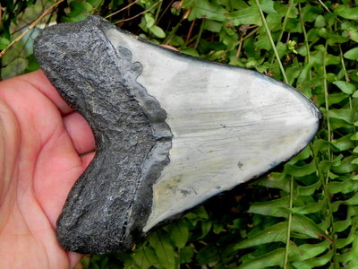 The megalodon shark lived in the Miocene/ Pliocene era approximately 12 million years ago. Megalodon grew up to 60 feet long and had a deadly arsenal of 147 razor sharp teeth. There have been teeth found that exceed 7" long ! The formula for figuring length of the shark is done by the primary tooth measurements . Standard Measurements are taken from the tip to the longest root side. For every eighth of an inch equals 1 foot in length. There fore a 7" tooth would be 56' long. The megalodon fed on whales squid,large fish and anything that moved. The power of its jaws was incredible. They could slash through vertebrae and rib bones with ease. They could even slice through their own teeth teeth!